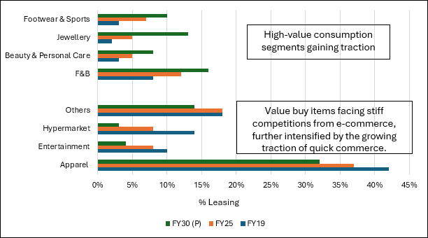 Apparel brands’ drop in leasing share tracks that of other value-buy categories like hypermarkets. They face stiff competition from e-commerce which is further compounded by the growing traction of quick commerce.