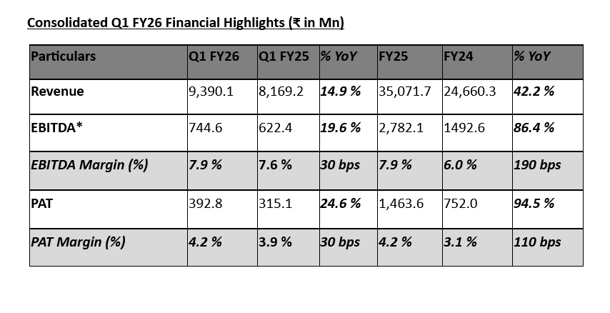 Revenue rose 14.9 per cent YoY to INR9,390 million while EBITDA grew to INR 745 million, up 19.6 per cent YoY.
