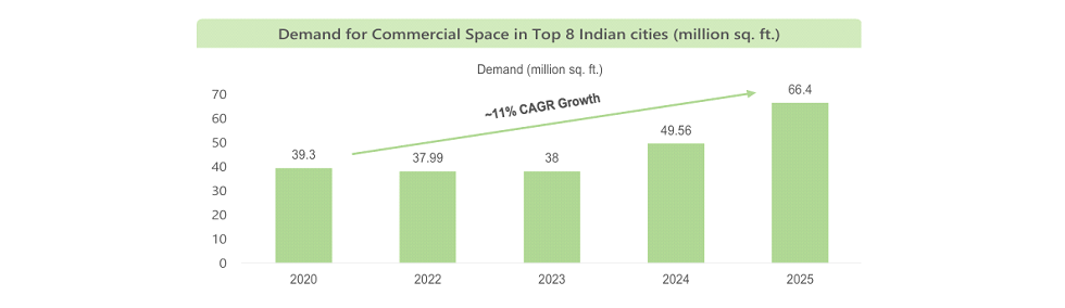 India has emerged as a high growth, cost-effective office space destination. Businesses are looking at India for scalability, affordability, and a skilled talent pool. The demand for commercial space in Top 8 Indian cities has grown at a 11% CAGR in the year 2020-25, from 39.3 mn sq. ft to 66.4 million sq ft.