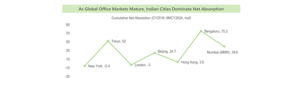 As global office markets mature, Indian cities dominate the net absorption. The cumulative net absorption of office space from CY16-9MCY24 for cities like New York (-) 5.4 mn sq ft, London (-) 3, HongKong 3.6 mn sq ft, Beijing 24.7 mn sq ft, Mumbai MMR 39.6 mn sq ft, Tokyo 52 mn sq ft and Bengaluru at the top with net absorption of 75.2 mn sq ft.