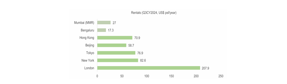 The office rentals as of Q3CY24 for Mumbai and Bengaluru was the most competitive among global cities. London was the costliest in terms of rentals for office space at $207 per sq ft per yr ($ psf/year). New York rentals recorded at $82, Tokyo at $76, Beijing at $56, HongKong $70, Mumbai at $27 whereas Bengaluru as the most affordable at $27/per sq ft per year.