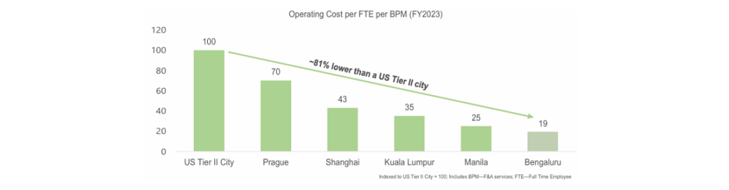 Bengaluru has emerged as one of the most cost-effective workforce cities for global enterprises, the cost is almost 81% lower vs Tier-II US cities. For comparison the operating cost in a Tier-II US city per FTE (Full Time Employee) per BPM Business process managedment is indexed at 100, the same is 19 for Bengaluru (As of FY23).