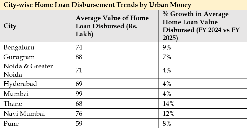 - Mumbai and Gurugram recorded the highest average home loan values at INR 99 lakh and INR 88 lakh, respectively, in FY 2025