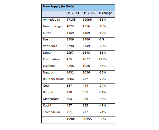 The seven state capitals in the top 15 tier 2 cities saw a 43 per cent decline in supply in Q1 2025.