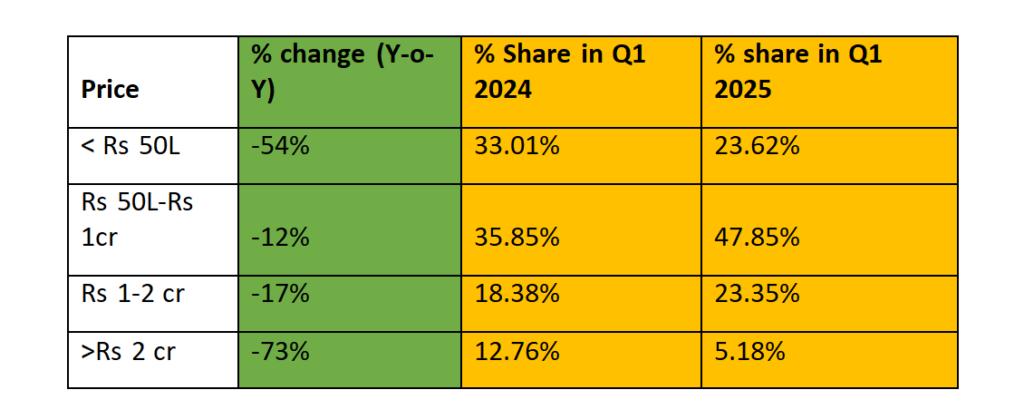 The supply of units priced INR 2 crore and above dipped by 73 per cent and its share dipped from 13 per cent to 5 per cent in Q1 2025.