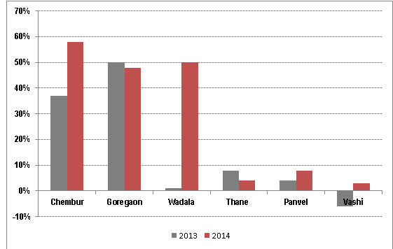 That said, Chembur and Wadala stood apart from this lacklustre trend in residential price growth. The two suburbs saw a tremendous price increase of 58 percent and 50 percent respectively in 2014 over 2013, thanks to completion of infrastructure projects like Eastern Freeway, which connects Chembur to South Mumbai, and the monorail, which was in the news recently for all the wrong reasons.