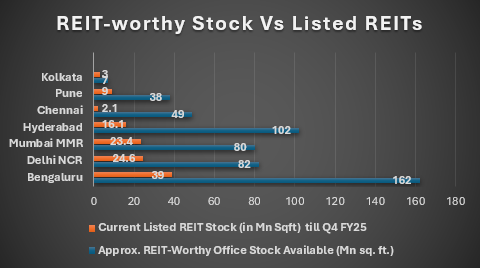 - Bengaluru has the highest REITable office stock of approximately 162 MSF, of which just 24 per cent, or around 39 MSF, is currently listed under REIT portfolios.