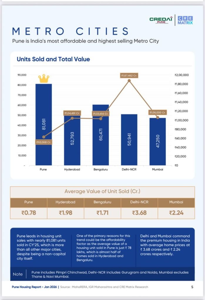 Commenting on the report, Manish Jain, President, CREDAI Pune, said, “Pune is surrounded by several recreational destinations within a short driving distance, making it an extremely attractive city to live in. With the Navi Mumbai International Airport becoming operational, international connectivity will improve significantly, further enhancing the city’s appeal. In addition, upcoming infrastructure projects such as the Ring Road are strengthening Pune’s long-term growth prospects.